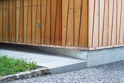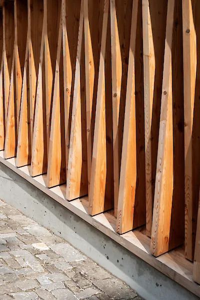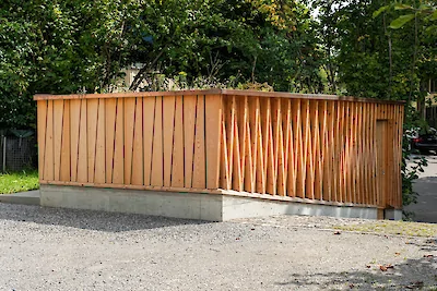 Das bepflanzte Dach und der filigrane Kupferdachrand fügen sich optisch als Erweiterung der Gartenlandschaft in die Umgebung ein. Eine betonierte Mittelwand und die Hauptfront aus massiven Lärchenlamellen führen die Dachlasten über eine Schwelle zum Betonsockel. Die tragenden Lamellen gehen an den Seitenfassaden nahtlos zu einer nichttragenden, sägerohen Fassadenschalung aus Lärche über. Auf der Rückseite des Pavillons kragt das Dach asymmetrisch aus und bietet so zusätzlichen Stauraum für Gartenutensilien.