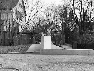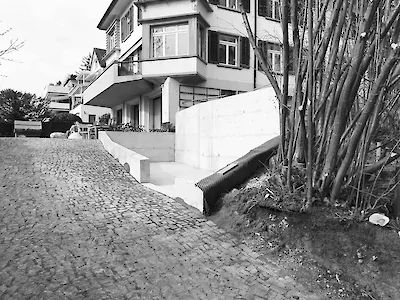 Als Ersatz für zwei Garagen wird im Garten der Kapfstrasse ein Velopavillon erstellt. Eingepasst in die abfallende, leicht abgewinkelte Zufahrtsstrasse aus Natursteinpflaster, die Parzellengrenze und die Bordsteinbegrenzung des Kiesvorplatzes nimmt der Pavillon auf bestehende Elemente Rücksicht. Durch die Einbettung in die Böschung bleibt er vom oberen Plateau aus entsprechend niedrig, der Blick in die Weite bestehen.