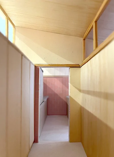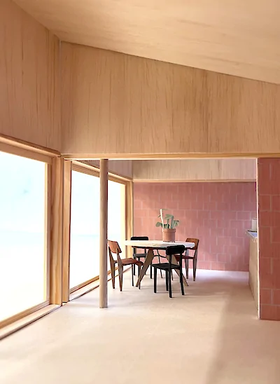 Das Hausinneren zeichnet sich durch eine gemauerte Schottenstruktur aus, die dem Längsbau rhythmisiert. In Position und Öffnungsgrad variierende Wanddurchbrüche erzeugen unterschiedliche Raumbezüge und Nischen. Aufgesetzte hölzerne Dachhüte unterstreichen in Ihrer abwechselnden Ausrichtung die Nutzung der einzelnen Räume und das Gefühl von Geborgenheit oder Offenheit. Die Fassaden zeigen eine klare Fügung der Elemente: Sockel, bandartige Fenster und Dach. Die liegende Lärchenschalung betont die Horizontalität des Baukörpers.
