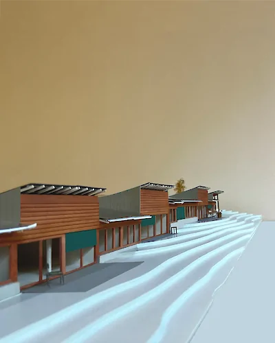 Die Wohnhäuser am Schlifiweg liegen in einem ruhigen Wohnquartier, in unmittelbarer Nähe zum Rickenbach und der Alten Schleiferei Menziken. Ein langgestrecktes Volumen folgt in abgetreppter Form der abfallenden Strasse und fügt sich in die Böschung ein. Die ebenerdige, eingeschossige Wohnzeile bildet gegen Westen den Abschluss eines grosszügigen Grünraumes. Gegen Osten spannt sie mit den gegenüberliegenden Nachbarhäusern ein gemeinschaftlich genutzter Aussenraum auf. Erschlossen werden die altersgerechten Wohnungen strassenseitig über hindernisfreie Rampen, die zu den rückwertigen Hauseingängen führen.