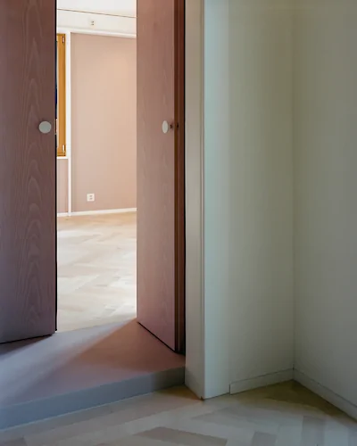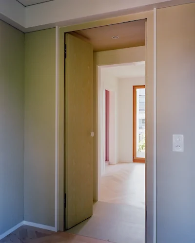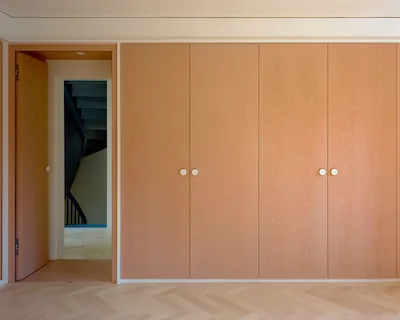 Neue Einbauschränke in den Zimmern im Obergeschoss wirken raumbildend und dienen als Filter zwischen dem offenen Treppenhaus und den intimen Schlafräumen. Eine Nische mit zweiflügeliger Zimmertür inszeniert das bewusste Betreten des Raums.