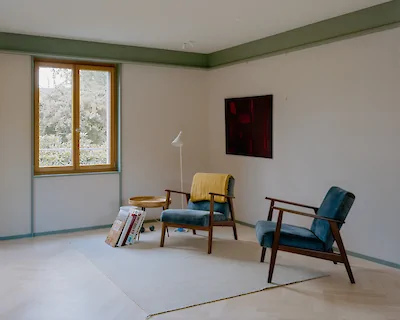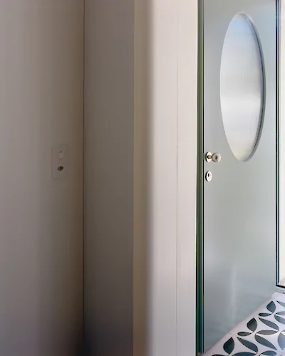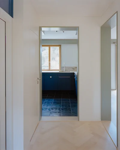 Im Inneren werden Küche, Bäder und Haustechnik erneuert, die Räume neu bekleidet und bepinselt. Die Küche wird zum Essraum hin geöffnet, wobei die klare Gliederung des Grundrisses in vier Zonen weiterhin respektiert wird. Die Kochinsel zeichnet diese Vierung räumlich nach. Oberflächen und Bauteile werden durch Deckenfriese, Vorhang-, Bilder-, Fenster- und Sockelleisten gefasst und gegliedert. Diese Elemente erhalten eine über ihre unmittelbare praktische Funktion des Abdeckens oder zur Führung von Vorhang- oder Bilderschienen hinaus eine weitere wichtige Eigenschaft: Sie verbinden die Räume untereinander, wirken identitätsstiftend und prägen die beiden Wohngeschosse architektonisch.