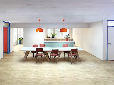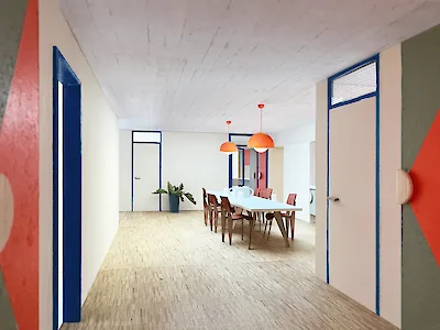 Besonderes Augenmerk gilt dem Erschliessungsbereich der Wohngeschosse. Dunkel und ohne räumliche Qualität werden sie durch gezielte Eingriffe neu interpretiert. Die Gemeinschaftsflächen wie Kochen, Wohnen und Essen befinden sich neu zusammenhängend und am sonnigsten, hellsten Ort. Die verglaste Küchentür bringt zusätzliches Tageslicht ins Innere, das neue Materialkonzept wertet die ehemals triste Mitte zusätzlich auf.